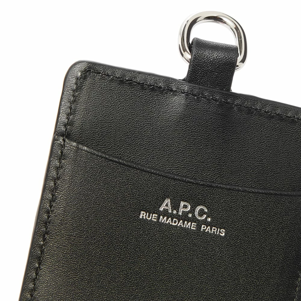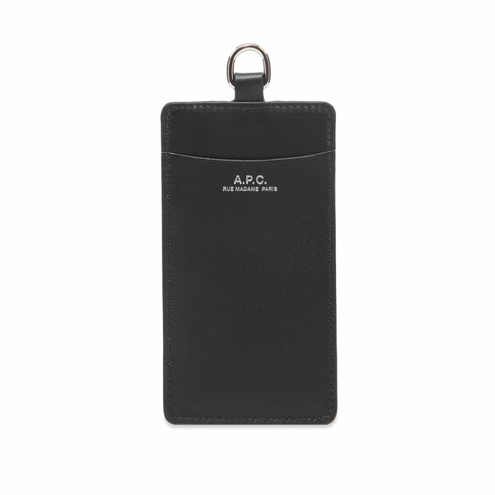 Keep your cards safe in style with this black strap card holder from A.P.C.. Crafted from smooth leather, it’s fitted with four card slots, a compact slip compartment and luxe, silver-toned hardware. To finish, it features signature branding printed on the front, while an embossed ‘A’ details the reverse.