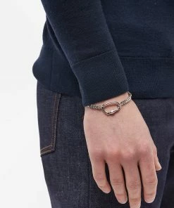 While A.P.C. creates elevated staples with understated French flair, they’ve always retained a utilitarian slant. And, nothing says utility like a carabiner lock. Taken as the main feature of this bracelet, it’s silver and strung on a chunky chain elevating it from a practical accessory to a chic adornment.