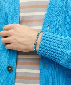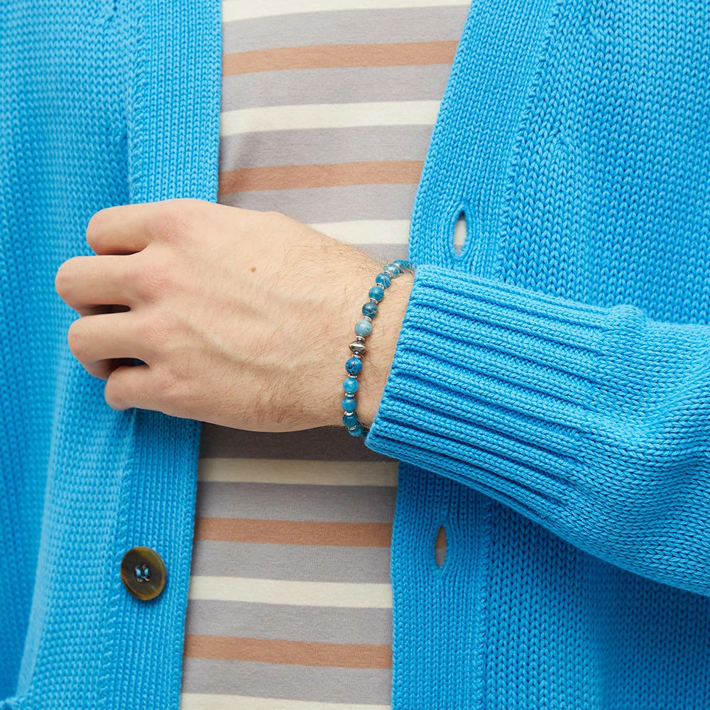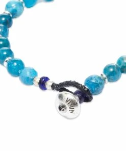 Mikia’s pieces are inspired by designer Aki Mitsubayashi’s love of travelling- and it shines through this bracelet. This version is strung with polished blue apatite and silver beads and it fastens with a signature button.