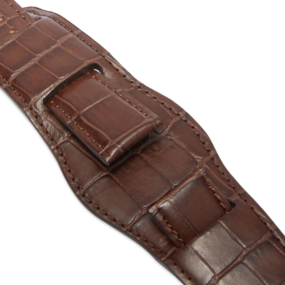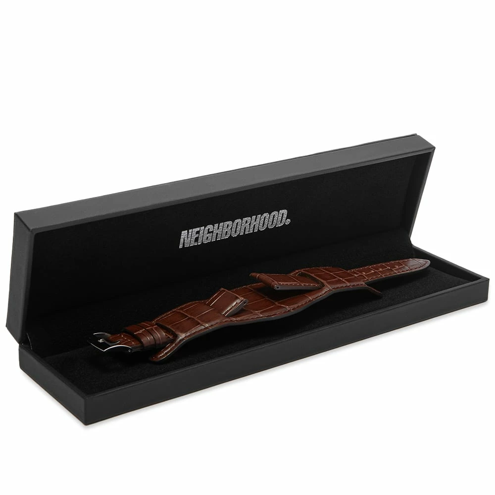 Established in the ’90s by motorcycle enthusiast Shinsuke Takizawa, Tokyo-based brand Neighborhood is rooted in biker culture, rock and roll, punks and rebels. This watch strap adds an edge to any ‘fit. Itβs crafted from a subtle sheen cowhide leather which is stamped with a crocodile pattern.