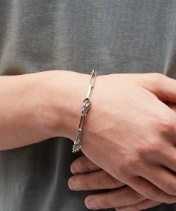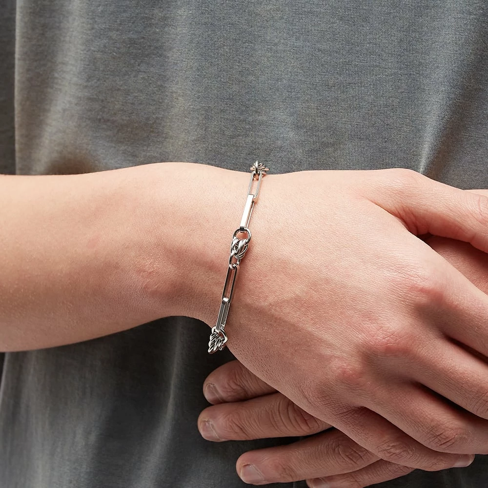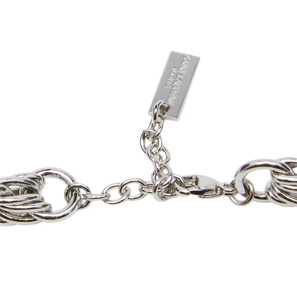 Saint Laurent adds a vintage yet rustic edge to your accessory lineup with the Alte chain bracelet. A vintage style chain with alternating sections of metallic cable and knit links to create a utilitarian inspired aesthetic with the brand’s logo engraved on the closure plaque.