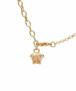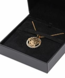 On the floor of a Grecian ruin where Gianni Versace played as a child, a Medusa head inspired him – she made you fall in love with no way back. Now Versace creates iconic pieces based on this history, such as the Medusa medallion necklace. Crafted in Italy, the necklace features a gold toned pendant depicting the Medusa head which has been intricately carved and framed by a silver Greca border.