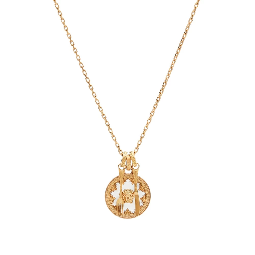 Versace is no stranger to opulence, but this takes a playful edge with this Medusa Plate necklace. The delicate gold-tone chain is strung with a miniature plate, intricately engraved with the label’s signature Medusa head motif and matching cutlery, too.
